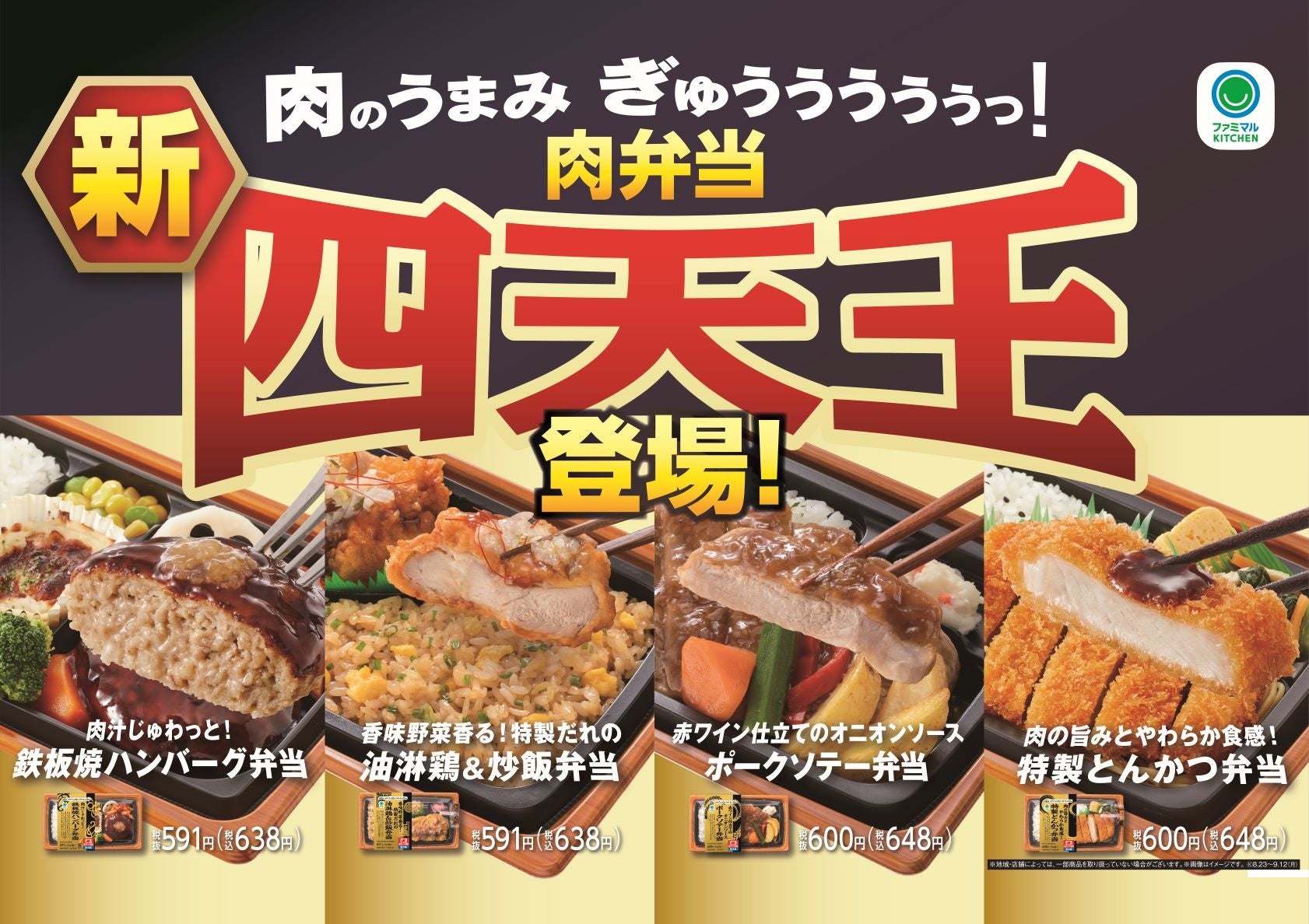 株式会社ファミリーマート(本社:東京都港区、代表取締役社長:細見研介)は、昨年から取り組んでいる5つのキーワードの「もっと美味しく」の一環として、2022年2月に発売し大好評をいただいたプライベートブランド「ファミマルKITCHEN」の「肉弁当 四天王」をリニューアルし、「【新】肉弁当 四天王」として、8月23日(火)より全国のファミリーマート約16,600店で発売いたします。