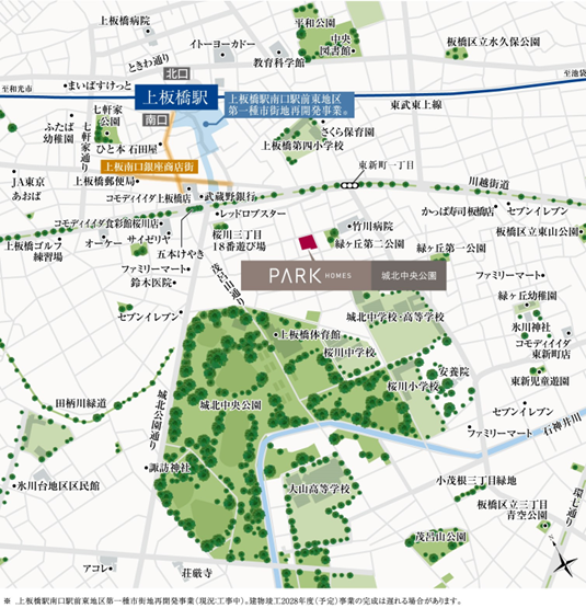 ※1 「上板橋駅南口駅前東地区第一種市街地再開発事業」により、今後パークホームズ城北中央公園から上板橋駅までの徒歩分数は変更となることがございます。
