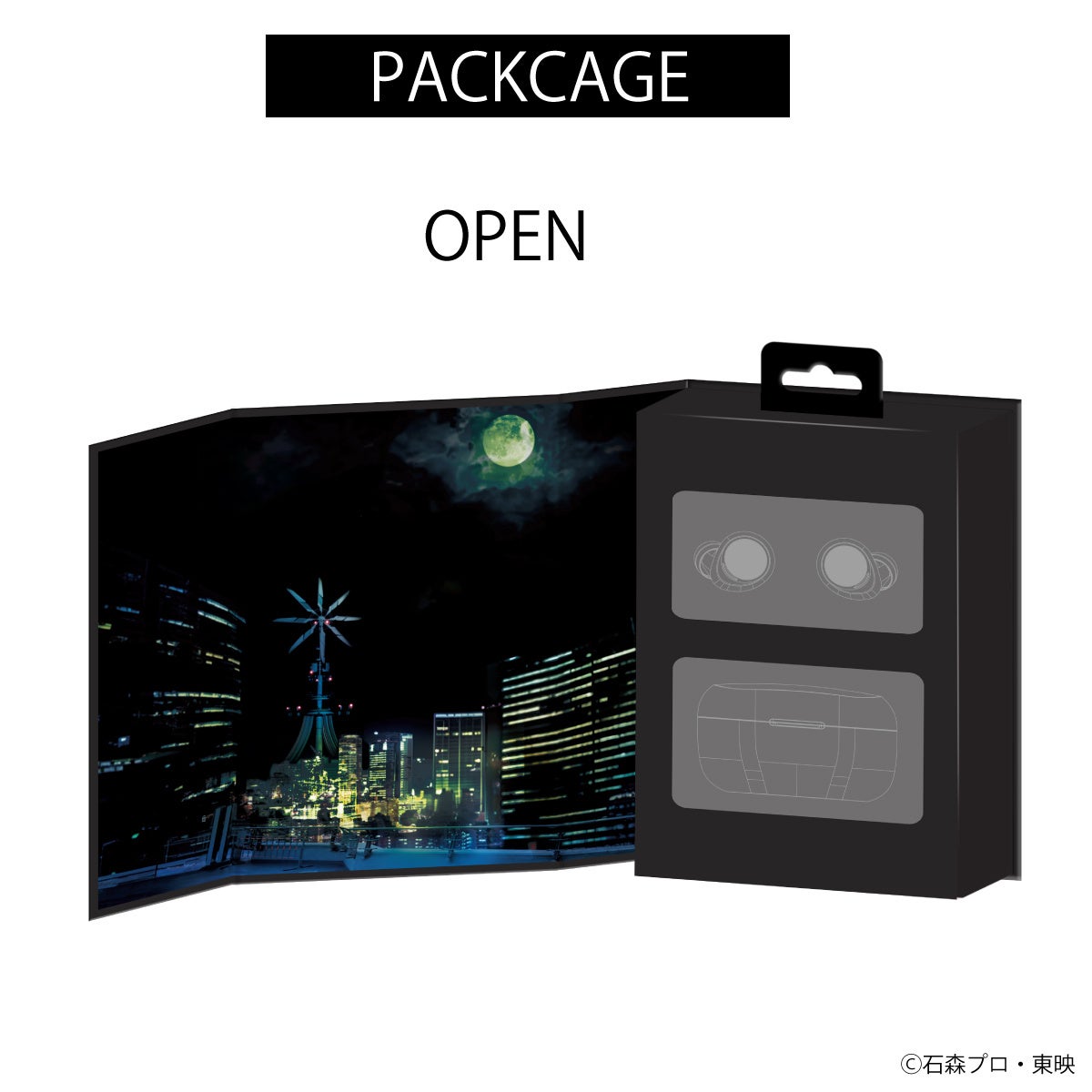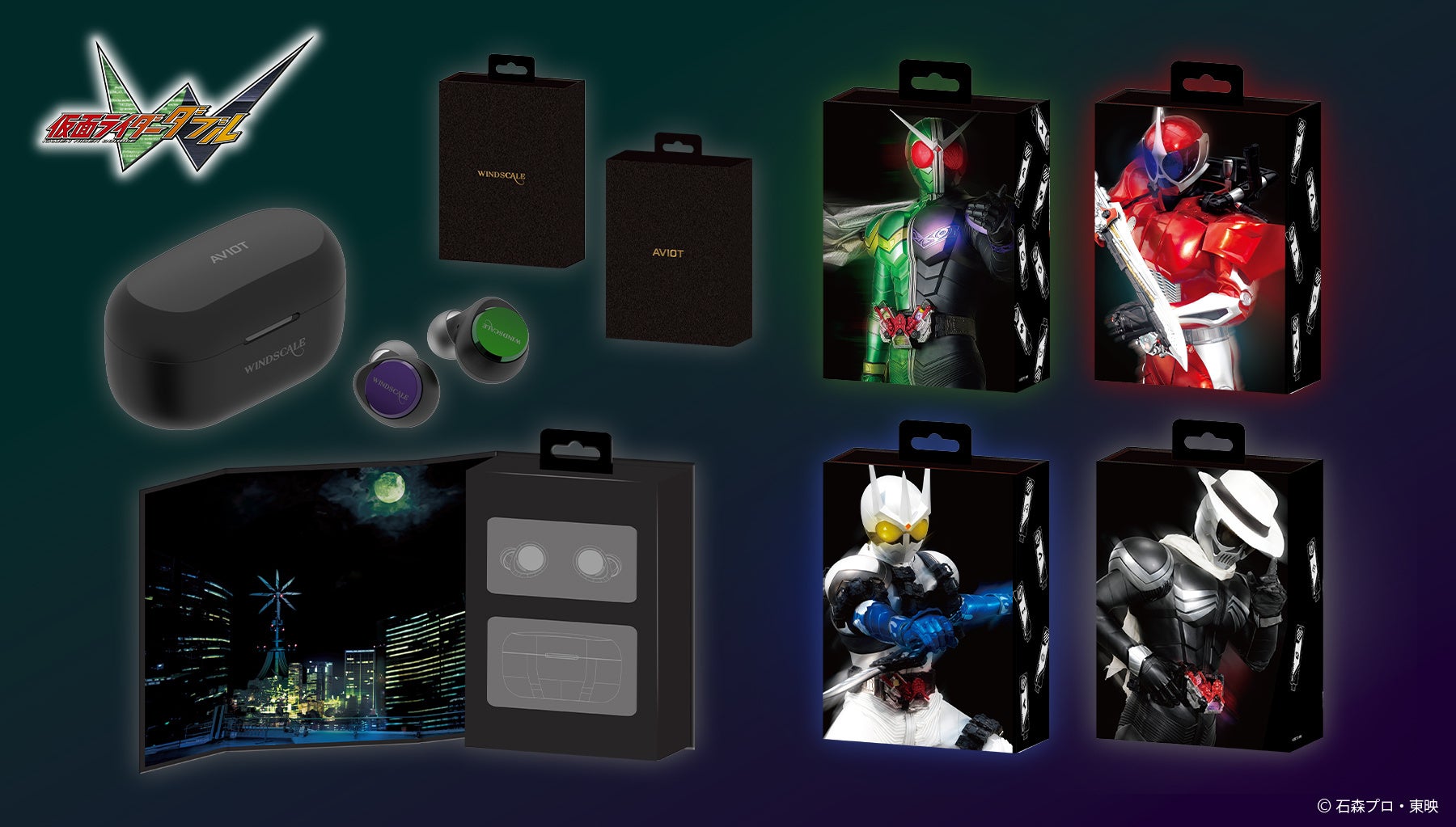 パッケージ表面と裏面には、それぞれ「WIND SCALE」とAVIOTのロゴをあしらい、内側には劇中でも印象的な風都の夜景を配置。