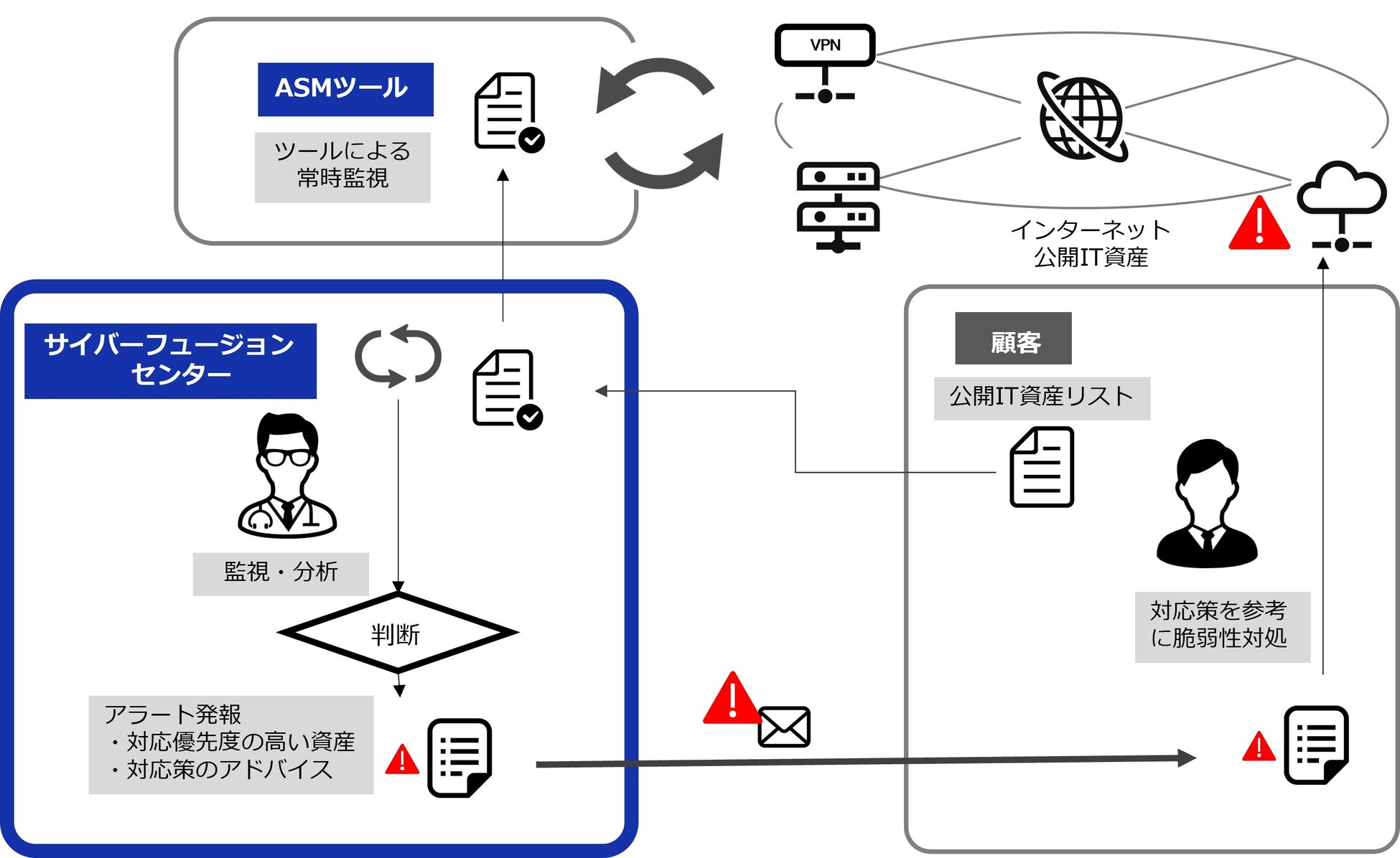 セキュリティリスクの監視・検知には、実際の攻撃者と同じ戦術・技術を用いて調査対象のIT資産のサイバー攻撃のリスクを評価する「Attack Surface Management (ASM)」ツールを用います。DNPは企業・団体に代わって、ASMツールを監視し、出力される情報に対し攻撃可能性やIT資産の重要性などを考慮した分析と対応の優先度付けを行います。早期に対策が必要なリスク情報は対策例とともに早期に報告し、企業・団体にセキュリティ対策を促します。