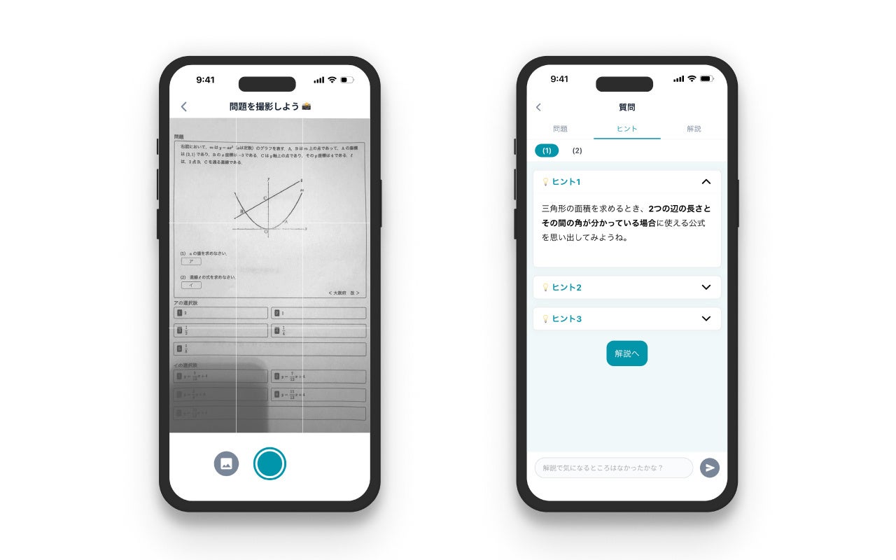 本アプリは、生徒が問題を撮影するだけで、いきなり答えを提示するのではなく、文部科学省の学習指導要領に準拠した「ヒント」から段階的に理解を促し、解説、さらには類題提示(※今後実装予定)までを一貫して提供する学習サポートツールです。
