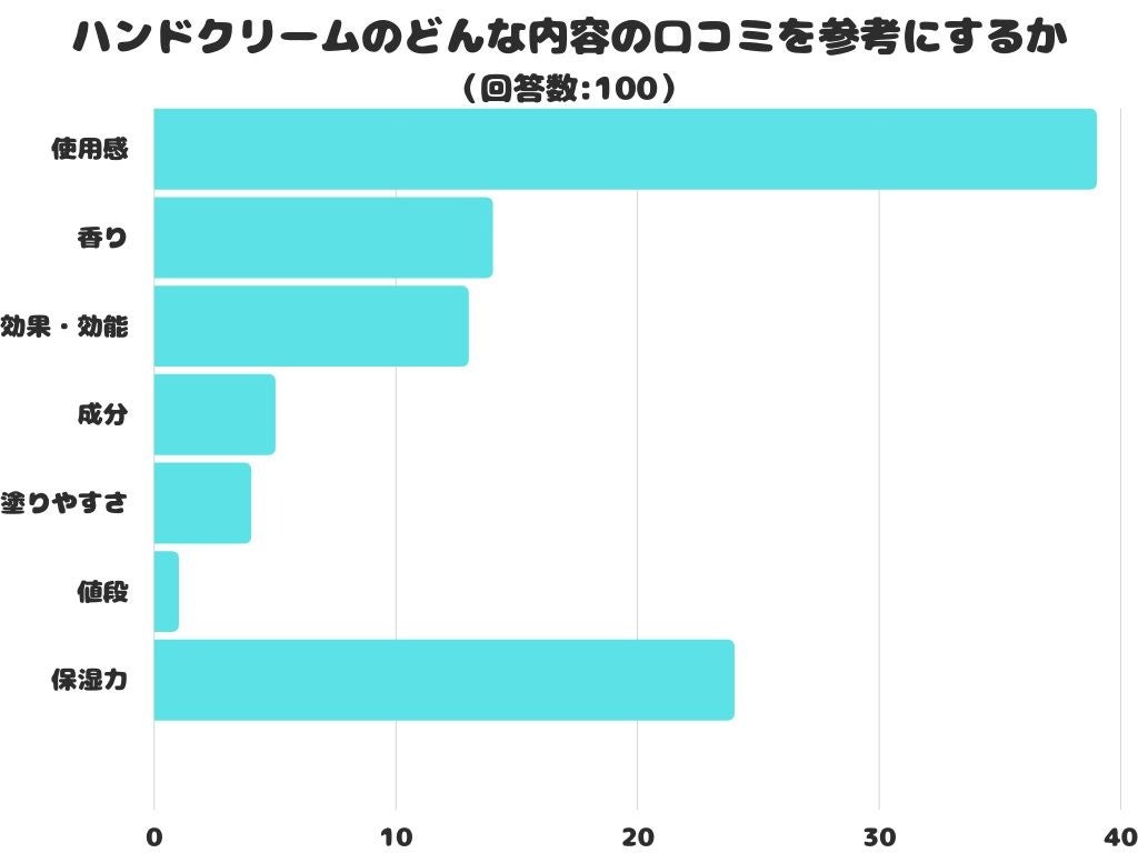 ハンドクリームのどんな内容の口コミを参考にするかをアンケートにて調査したところ、1位は「使用感」でした。