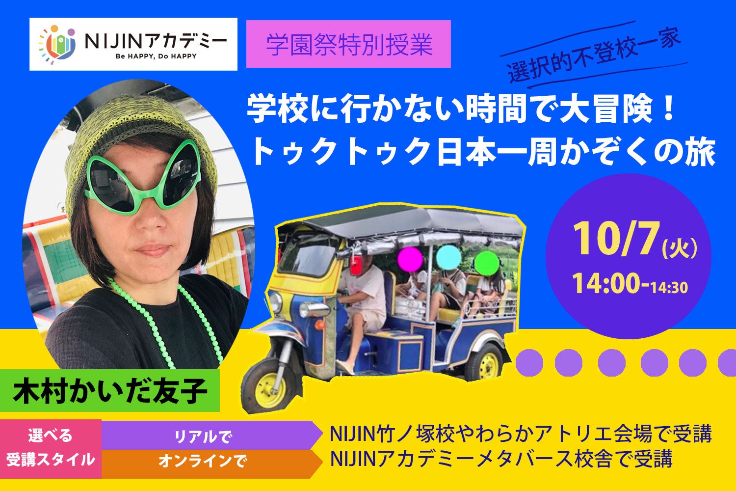 このイベントは、NIJINアカデミーの学園祭特別授業のひとつとして企画されました。NIJINアカデミーは、すべての子どもが自分らしく輝けるよう、学校という枠にとらわれず質の高い学びを提供しています。トゥクトゥクで日本一周しながら学校以外の場所において、様々な人の考え方や暮らしに出会い深い学びの経験をお持ちの改田さんから、不登校ならではの学びの作り方のヒントを教えていただこうと思います。