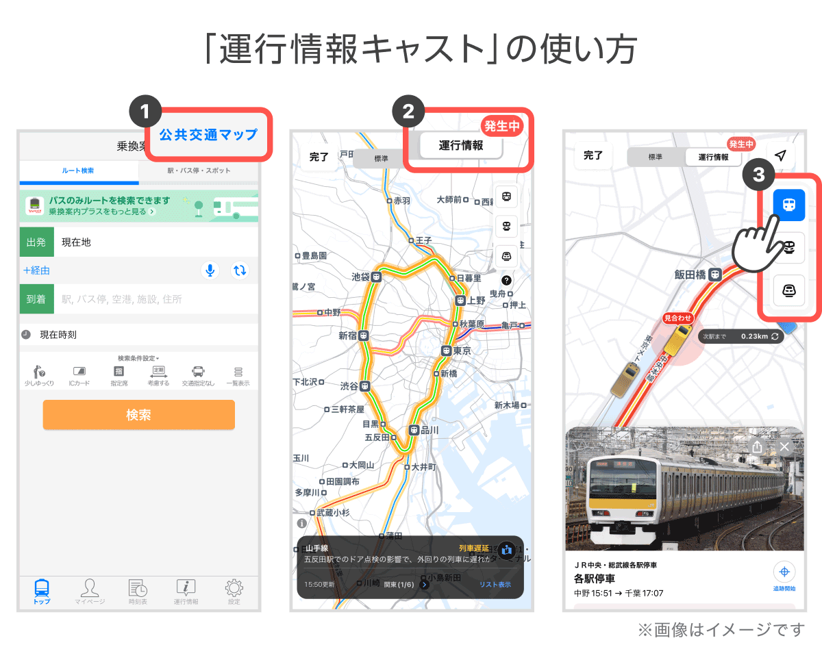 このたび、鉄道ファンをはじめ、公共交通機関を利用するユーザーの移動がより快適になるようサポートしたいという思いから、「トレインキャスト」に続き、全国の鉄道の運行情報(列車の遅延・運転見合わせ・運転再開など)が一目で分かる本機能の提供を開始しました。本機能は、全国を走行している新幹線・有料列車・普通列車の運行情報に対応しており(※4)、「トレインキャスト」と重ねて利用もできます。