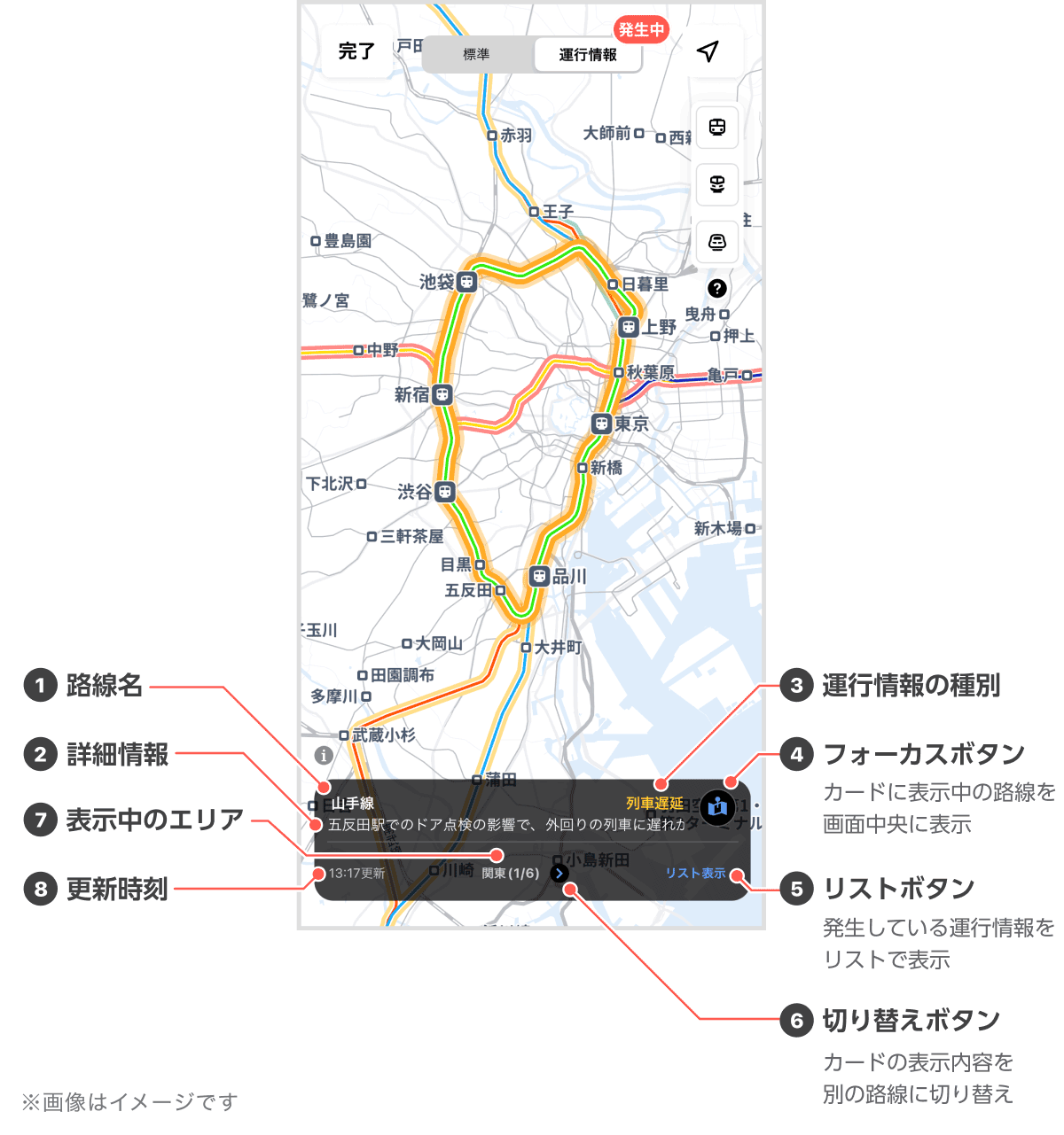 全国の鉄道情報を地図上で可視化する「トレインキャスト」に続き、列車の遅延や運転見合わせが発生している路線や該当区間の運行情報の確認が可能に