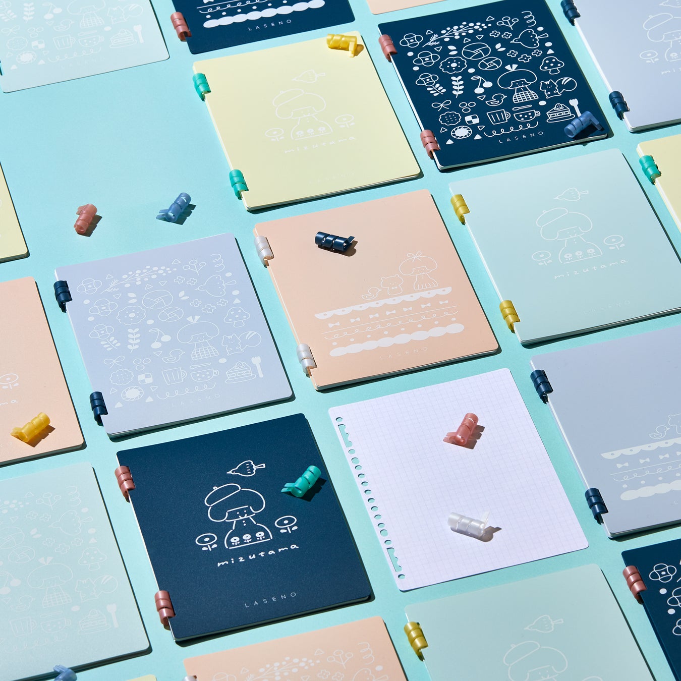 らせん形状のやわらかいリングが特長のリングノート「LASENO(ラセーノ)」のカスタマイズイベントを実施します。お好きな表紙、リング、リーフを100通り以上の組み合わせから選んで作ることができ、表紙は大人気イラストレーター mizutama(@mizutamahanco)さんのデザインです。