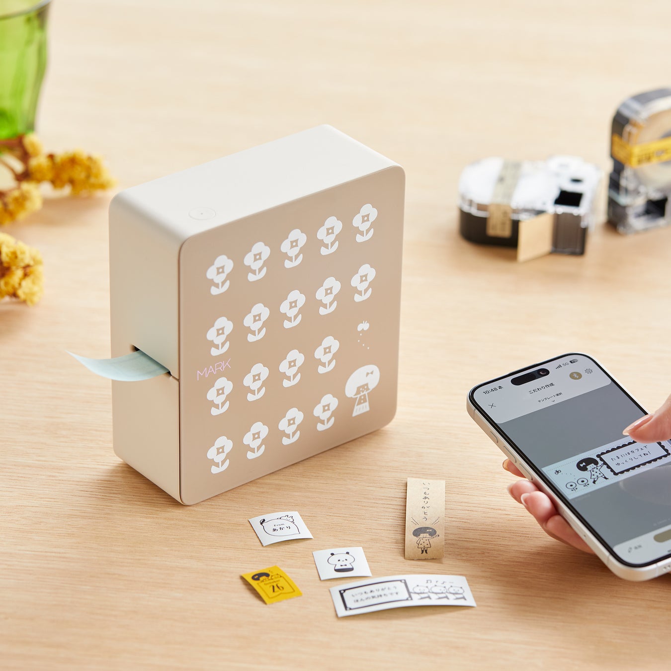 スマホとつないで簡単にラベル作成ができる「テプラ」PRO “MARK” SR-MK1を、mizutamaさんのデザインでご用意しました。 「テプラ」PRO用アプリ「Hello」(無料)にはmizutamaさんとコラボレーションした絵文字やテンプレートが