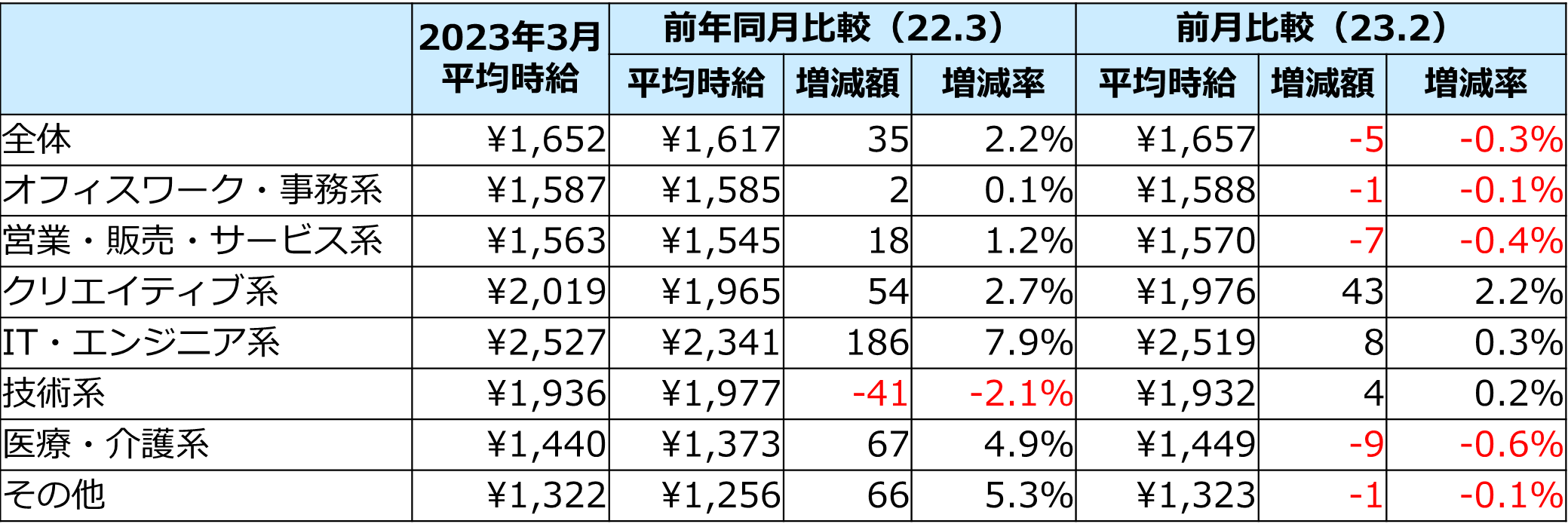 2023年3月度の三大都市圏平均時給は1,652円(前月比-5円・-0.3%減、前年同月比+35円・2.2%増)。前月比ではマイナスの一方、前年同月比は+35円と大幅に上昇しました。平均時給の上昇には、IT系の時給上昇と、時給の低い介護系の求人数減少が影響しています。