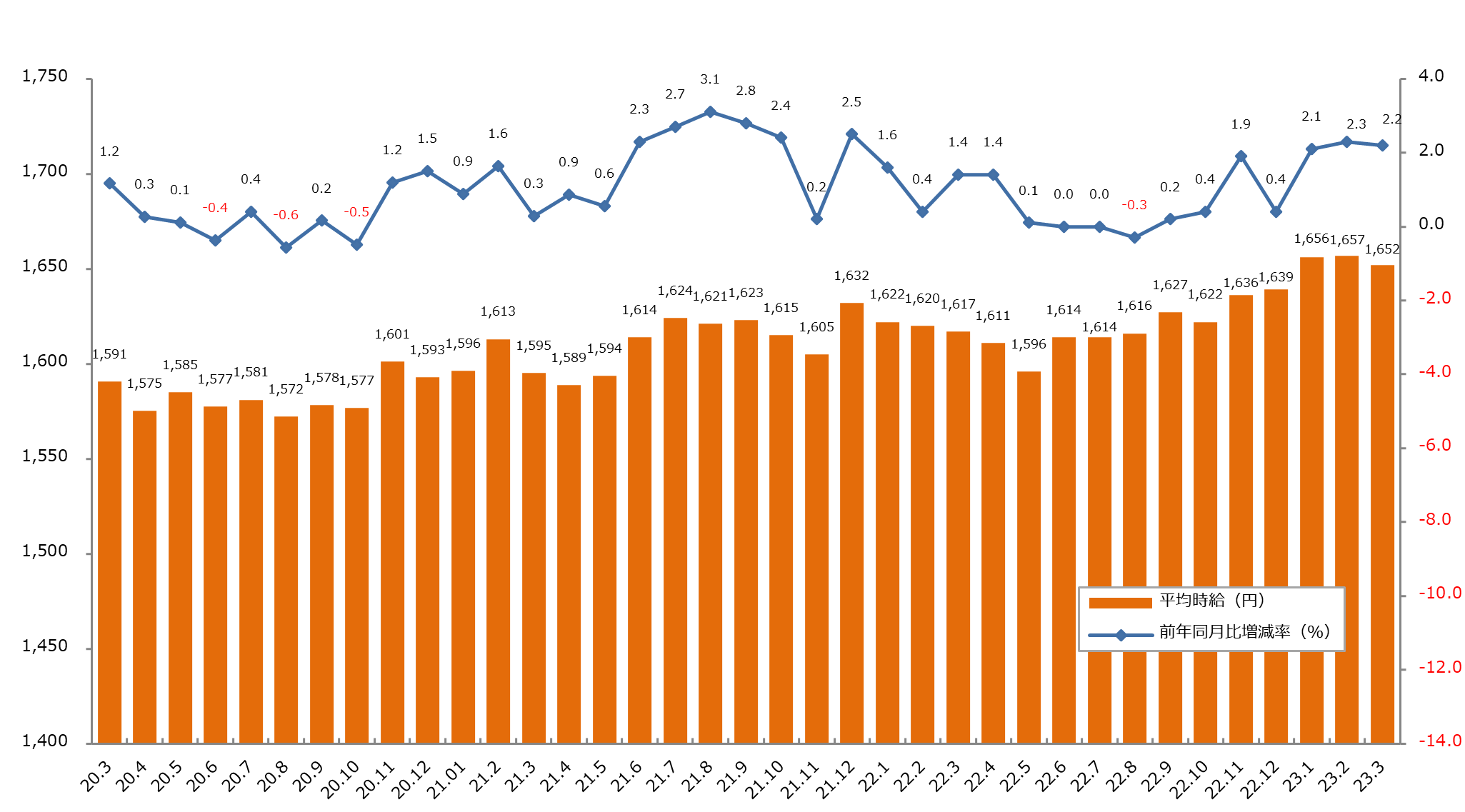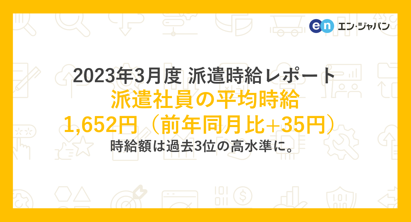 2023年3月度 派遣社員の平均時給は1,652円5か月ぶりに前月比を下回るも、時給額過去3位と高水準は継続。