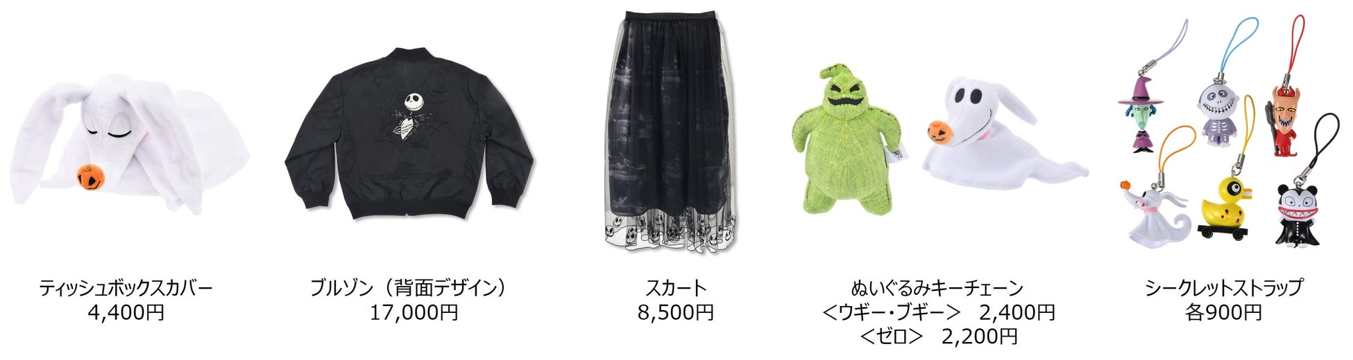 ラインナップは、ライトアップフィギュアや小物入れ、ティッシュボックスカバーといったお部屋を彩るインテリア雑貨から、背面にジャックと作品名ロゴの大胆な刺しゅうを施したブルゾン、チュールの裾にデザインしたジャックのフェイスが目を引くスカートなど、コーディネートのアクセントとして楽しめるファッションアイテムまで幅広く展開します。そのほか、ちょっぴり不気味な雰囲気が漂う愛らしいキャラクターたちのぬいぐるみやぬいぐるみキーチェーンも充実。さらに、大人気のシークレットアイテムからは、コレクション心をくすぐるストラップとピンバッジもご用意しました。