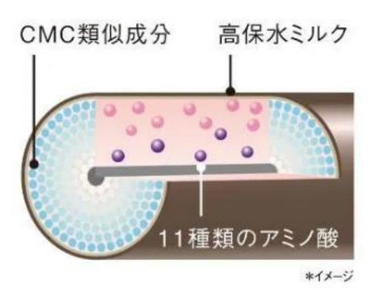 毛髪補修効果の高い CMC 類似成分※5、アミノ酸をブレンドした浸透美容液成分を高保水ミルク※6の中にとじこめた“美容液 in ミルク処方”を採用。美容液成分が髪の芯まですばやく浸透しながら、高保水ミルクが髪表面をコーティングし、髪の外側から内側まで同時にケアします。