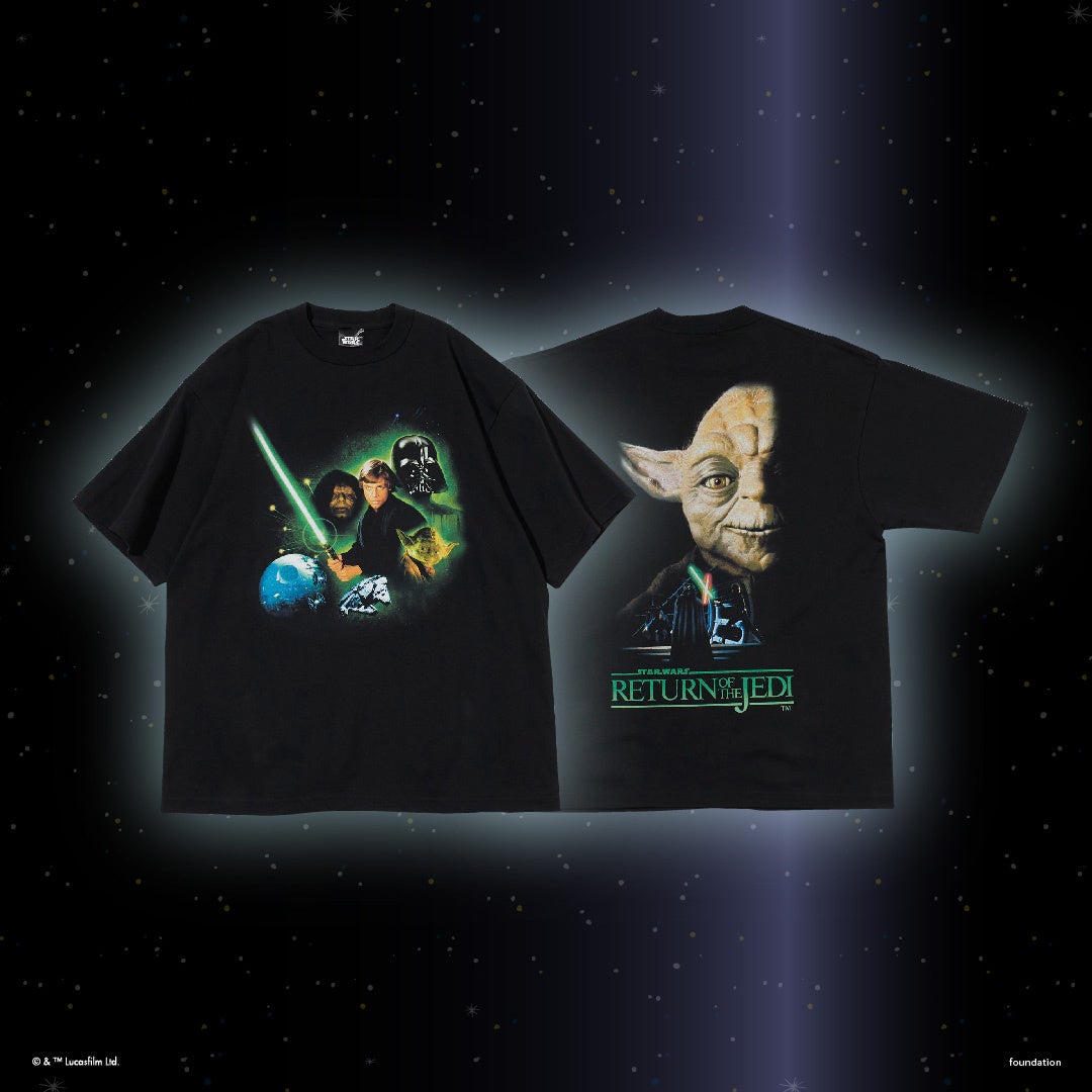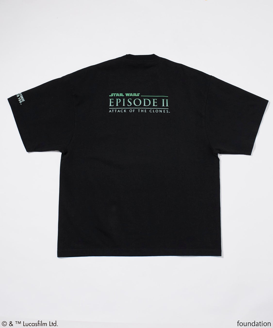 『スター・ウォーズ/クローンの攻撃 (エピソード2)』より、フロントは手にもつライトセーバーが輝くモノクロの「ジェダイ・マスター ヨーダ」を大きくプリントし、バックにはロゴを配し、左袖には〈MAY THE FORCE BE WITH YOU.〉の文字ををあしらいました。