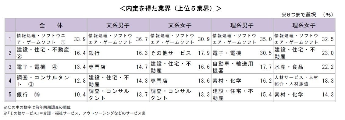 ○「情報処理・ソフトウエア」に内定が集中、文理男女とも3割超。「銀行」の順位が上昇