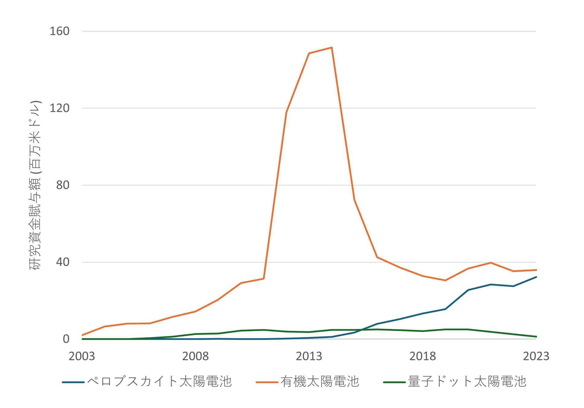 図1では、2003年から2023年までの期間における3種の太陽電池に関する研究資金(グラント)の総額をプロットしています。中国以外の全世界の研究プロジェクトを対象としています(中国では2021年ごろからグラント金額が公開されなくなったため除外)。複数年にまたがる研究プロジェクトは、各年に均等割りして算出しています(例えば期間が5年で総額が100万米ドルのプロジェクトは各年に20万米ドルずつ計上)。