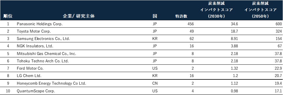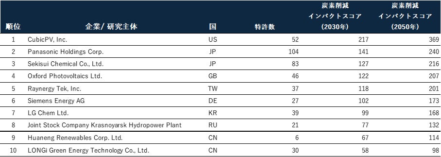 表5はペロブスカイト太陽電池に関連する国際展開発明を対象にした企業別の炭素削減インパクトスコアランキングです(※注)。