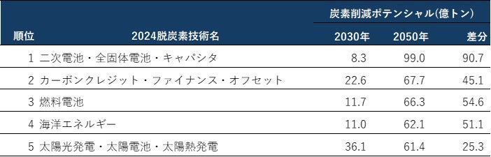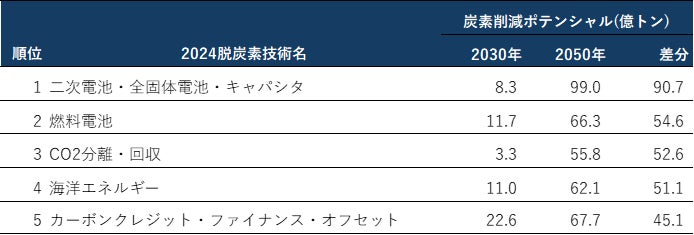 一方、2050年時点では、「二次電池・全固体電池・キャパシタ」分野が99億トンともっとも高く、2位の「カーボンクレジット」領域を大きく上回りました。また、「燃料電池」をはじめとする電池関連技術も上位にランクインしています(表3)。