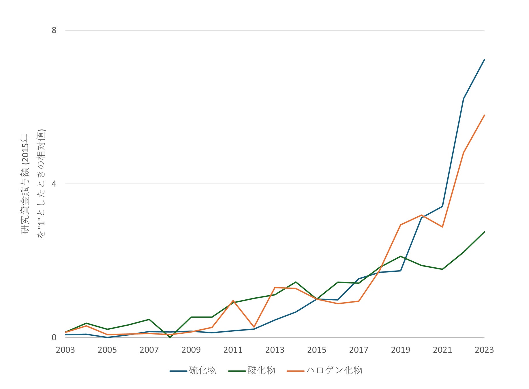 2023年時点では、硫化物系への研究投資が最も多く、ハロゲン化物系と酸化物系がそれに続いています。一方、2015年を「1」とした相対的な増加率(図4)では、硫化物系は最も高い成長を見せています。ハロゲン化物系も急成長傾向にあり、今後の拡大が期待されます。