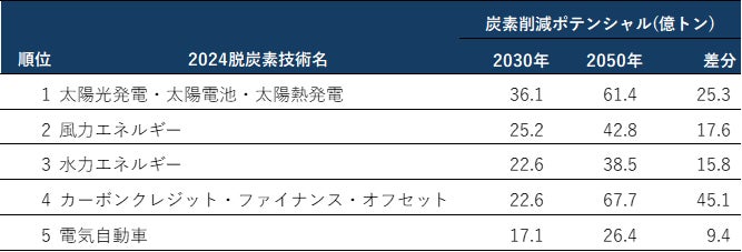 アスタミューゼが算出した「炭素削減ポテンシャル」によると、2030年時点では「太陽光発電・太陽電池・太陽熱発電」分野が36.1億トンで最大の削減効果を持ち、続いて「風力エネルギー」や「水力エネルギー」など再生可能エネルギー関連技術が高いポテンシャルを示しました(表2)。