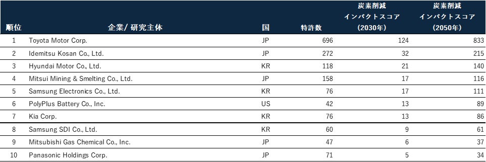 今回の分析では、2002年以降に複数の国・地域で出願された「国際展開発明」を対象に、企業ごとの炭素削減インパクトスコアを集計しました。今後の技術開発や事業戦略の方向性を示す上で、注目すべき指標となります。