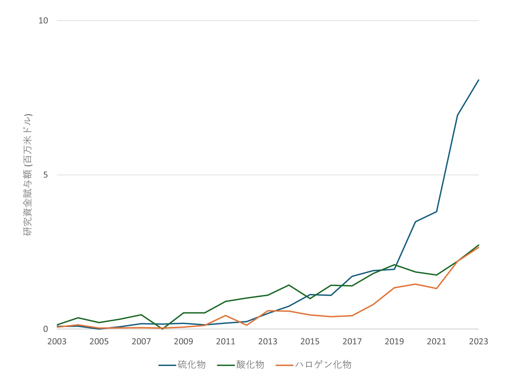 これらの電解質は、それぞれ異なる特性を持つため、用途や設計要件に応じて使い分けが可能です。ただし、現時点では市場性や商用化の見通しはまだ定まっていません。アスタミューゼでは、これら3種の電解質に関連する競争的研究資金(グラント)の推移を分析し、技術領域ごとの研究投資の傾向を可視化しました。