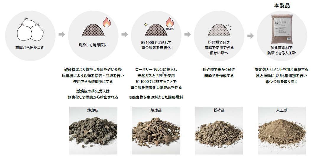 本商品の原料は、各市町村のごみ焼却場で発生する「一般家庭ごみの焼却灰」です。焼却灰は廃棄物として埋め立てられるのが一般的ですが、本商品では、焼却灰に含まれる重金属を熱処理により無害化する特殊製法を採用し、安心して使用できるアップサイクル品として生まれ変わりました。
