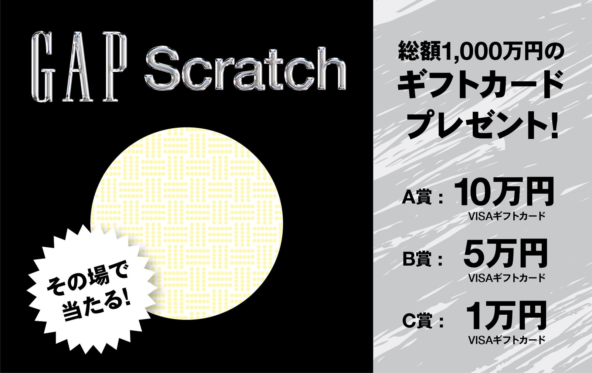 さらに、全国のGapストアで税込み5,000円以上ご購入ごとにスクラッチカードを1枚プレゼント。総額1000万プレゼントキャンペーンのスクラッチ抽選会に参加でき、スクラッチカードを削って当選された方にはその場で10万円、5万円、1万円のVISAギフトカードを贈呈いたします。