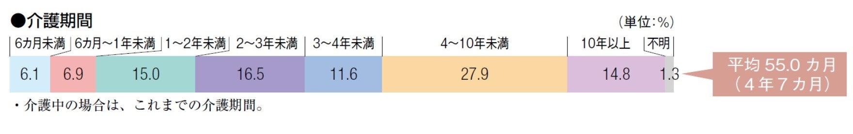 国内では年間10万人が介護を理由に離職し※1、介護離職者数が増加傾向にあることが大きな社会課題となっております。さらに2025年からは「団塊の世代」が75歳以上となることで、さらに深刻化することが予測されており、介護者の働きやすい環境整備が急がれる背景があります。加えて、介護期間が中長期にわたる実態も明らかになっており、介護期間の平均は4年7カ月に及びます。内訳を見ると、「4~10年未満」が27.9%、「10年以上」が14.8%となっており、合わせると4割以上が4年以上にわたり介護を行っている実態が示されています。