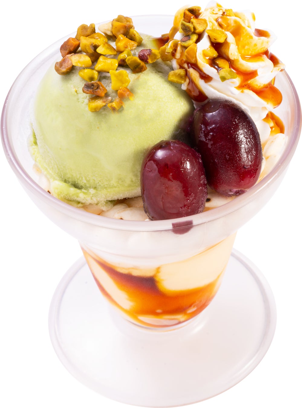 ピスタチオの香ばしくまろやかな味わいのアイスや人気のプレミアムプリン、フローズンのぶどうなどを盛り込み、ホイップクリーム、ローストピスタチオをトッピングしたパフェです。