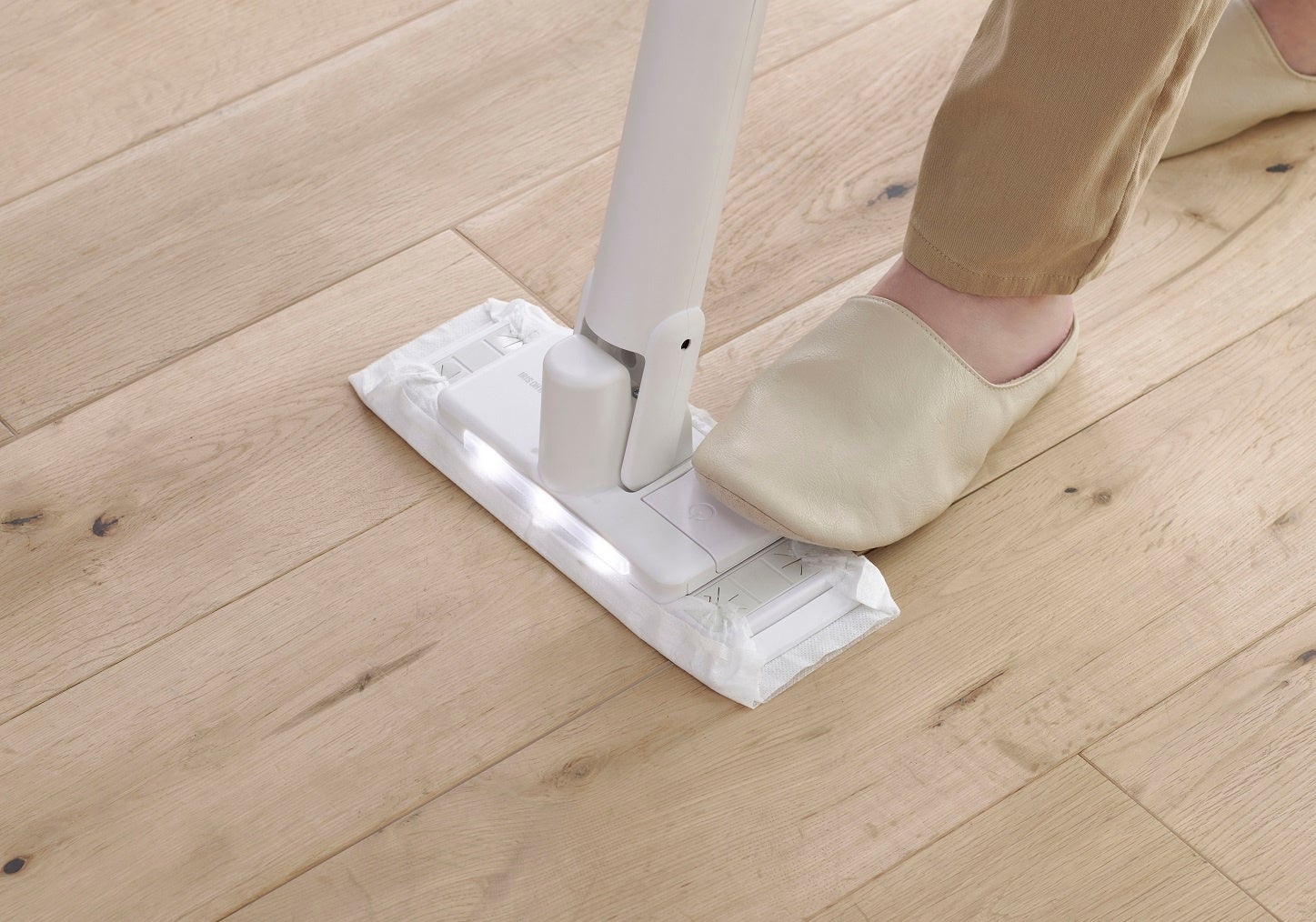 また、電源をオフにしてヘッドを振動させずに使い捨てドライシート(※2)を装着することで、フローリングワイパーとしても活用できます。掃除する場所や汚れの箇所によって水拭きと乾拭きを使い分けでき、ペットや子どもがいるところでも安心して使用できます。使い捨てシート(※2)は着脱式で手入れが容易で、モップを濡らしたり、使用後に水洗いしたりする手間が省けます。