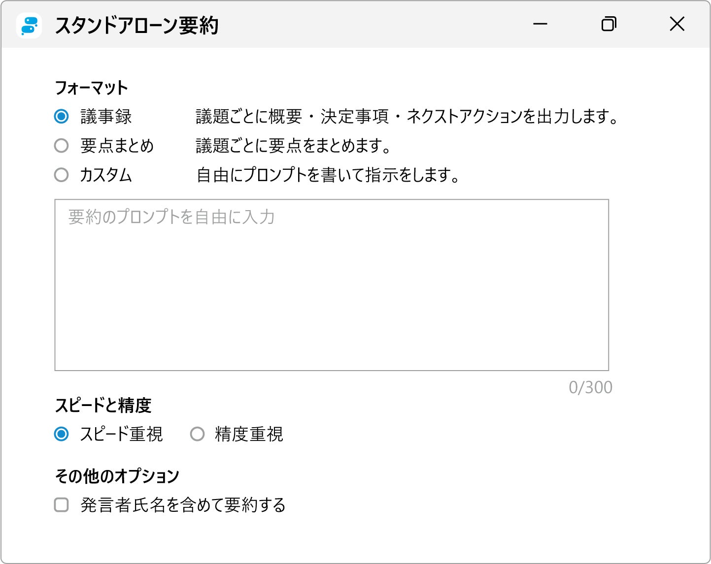 「ScribeAssist」のユーザーは、追加料金なしでスタンドアローン型の要約機能の利用が可能です。要約スタイルや、要約形式などを柔軟に組み合わせることで、より高度な情報整理を支援します。