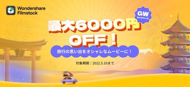 世界150か国以上で利用されるソフトウェアを手掛ける、株式会社ワンダーシェアーソフトウェア(東京都千代田区、代表:呉太兵)は、手軽にクオリティの高い動画が作れる動画編集ソフトWondershare Filmora(ワンダーシェアーフィモーラ)に使える素材サイトWondershare Filmstock(ワンダーシェアーフィルムストック)で、2022年4月28日(木)から2022年5月10日(火)まで、対象製品が最大6,000円OFFでお買い求めいただけるGWキャンペーンを実施いたします。