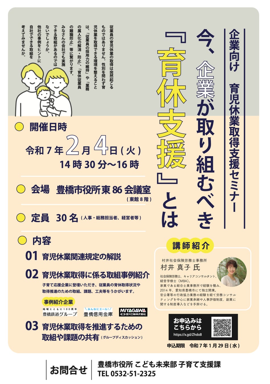豊橋市子育て応援企業が育休取得推進の取組を紹介「第2回育児休業取得支援セミナー 」を開催します