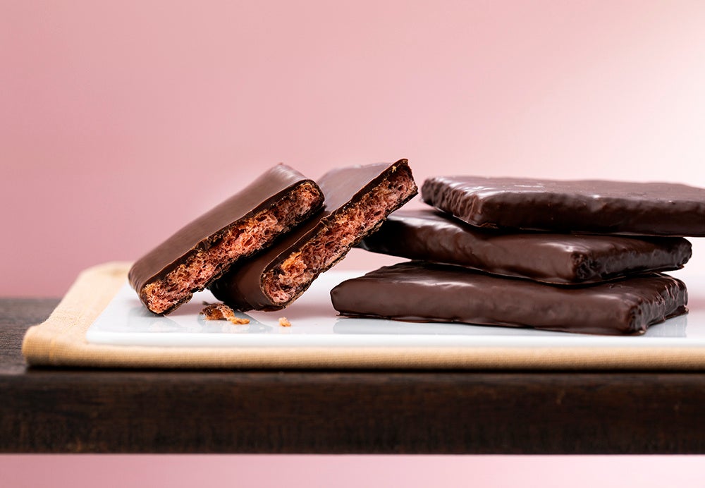 外側のチョコレートには「銀のぶどう」が誇る炭火焙煎クーベルチュールを溶かしこんだ“濃密ショコラ”を使用しています。いちごが香る自慢のシリアル生地全面にたっぷりかけた、甘酸っぱい季節限定リッチタイプです。まるでいちごのチョコフォンデュのようなおいしさをぜひ味わってみてください!