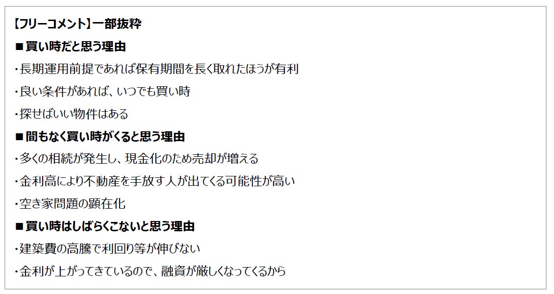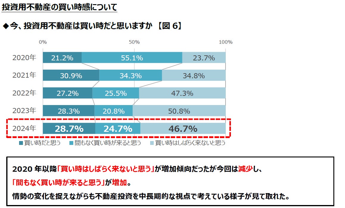 野村不動産ソリューションズ株式会社(本社:東京都新宿区/代表取締役社長:前田 研一)は、2024年6月10日~6月21日、「不動産投資に関する意識調査(第16回)」を実施いたしました。この度、調査結果がまとまりましたのでお知らせいたします。本調査は、投資用・事業用不動産サイト「ノムコム・プロ」の会員を対象に、年1回、投資用不動産の買い時感をはじめとする市況の見方や投資についての考え方をお聞きしているものです。