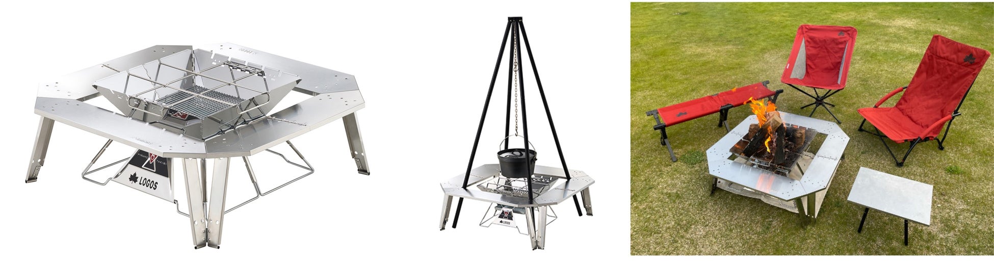 別売りアイテムとの組合わせ相性も抜群で、「LOGOS the ピラミッドTAKIBI XL」がジャストフィット。「ピラミッドTAKIBI」や「クワトロポッド」などと組合わせると、吊り鍋料理やたき火など、さまざまなスタイルが楽しめる。テーブルの高さは27.5cmとロースタイルなので、「難燃BRICKチェアシリーズ」とも相性抜群。