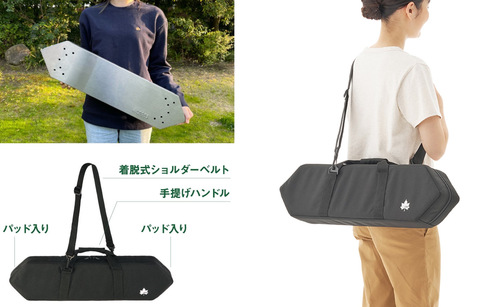 4人以上で囲めるサイズのテーブルでありながら、軽量で女性でも簡単に取り扱え、収納もコンパクト。付属の収納バッグは、手提げハンドルと肩がけできる着脱式ショルダーベルト付き。荷物が多いキャンプで両手が塞がっているときにも、シーンに合わせ2WAYでスマートに持ち運びができて便利。