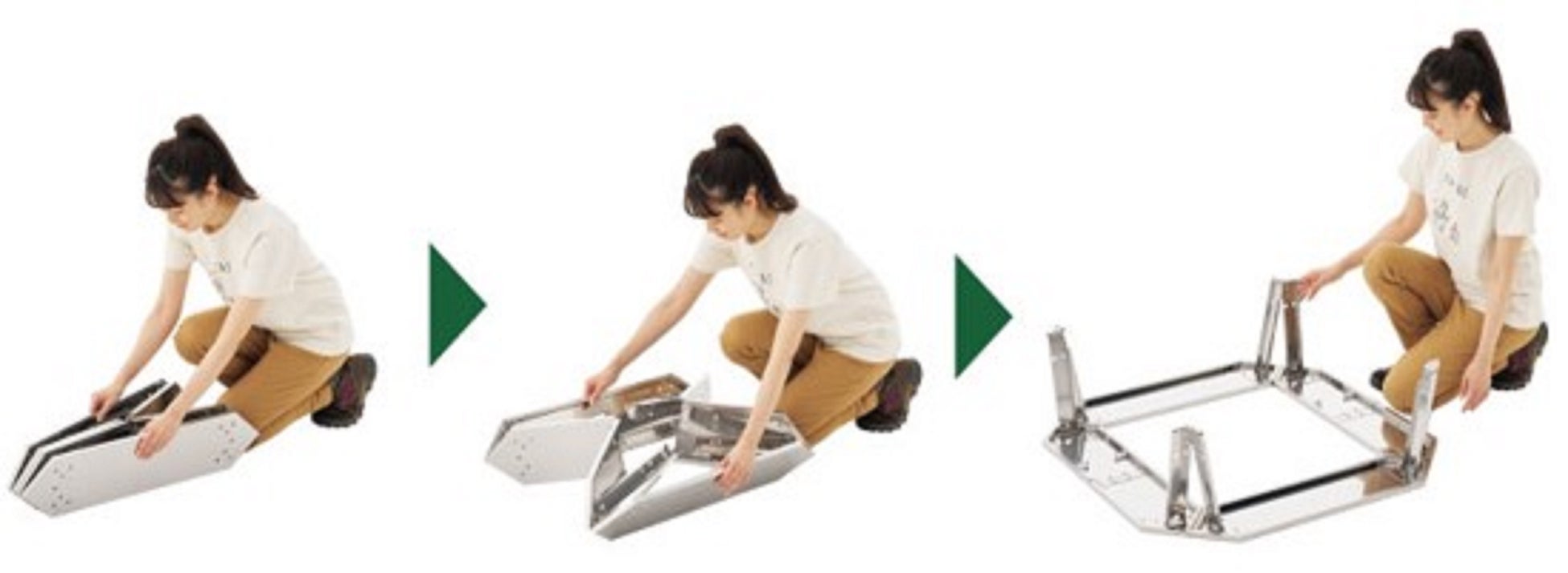 従来品の囲炉裏テーブルとは違い、シンプルな3ステップで組立てることができるため、準備時間を短縮し、家族団らんの時間をより作り出せるようになりました。4人以上で囲めるサイズのテーブルでありながら女性でも簡単に取り扱えます。足の構造も従来品よりパワーアップしており、安定感抜群の使い心地で安心して使用できます。