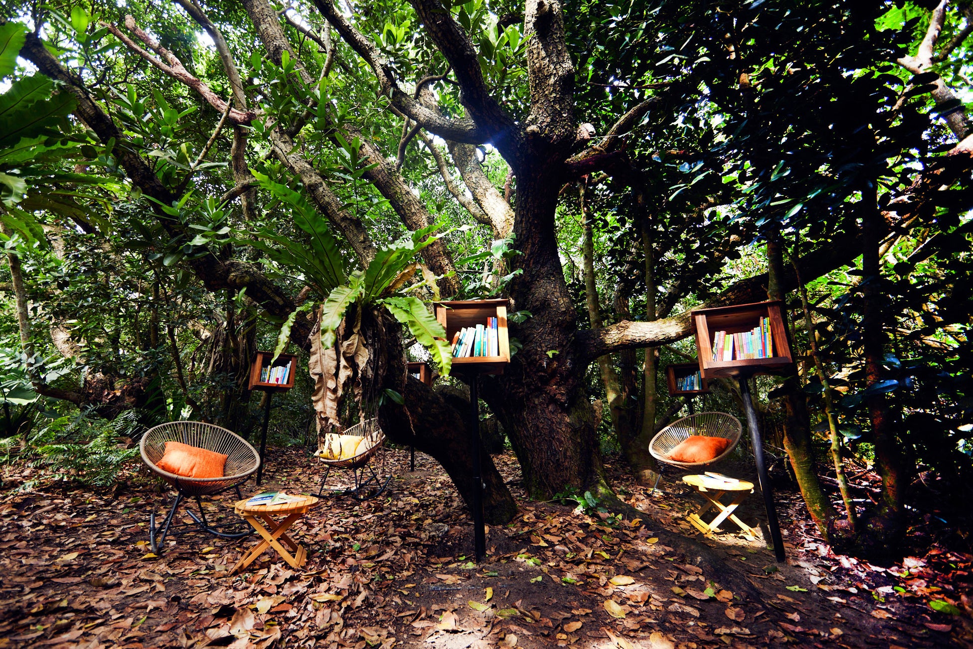 テリハボクは、熱帯から亜熱帯に育つ常緑樹で、国内では沖縄本島や八重山諸島に分布しています。ホテルの敷地内にも、高木で立派なテリハボクが自生しており、オオタニワタリやハブカズラなどの植物が着生し、ヤエヤマオオコウモリが実を食べにやってきたり、枝で鳥が羽を休めたりしています。さまざまな生物の拠り所として、ホテル敷地内のジャングルを象徴する樹木です。そのテリハボクの周りにブックシェルフを増設し、木の周りにはチェアやローテーブルを用意しました。雄大なテリハボクの木陰で、近くにいる生き物の鳴き声や植物の観察など、自然を五感で感じながら、ゆったりとした時間を過ごせます。