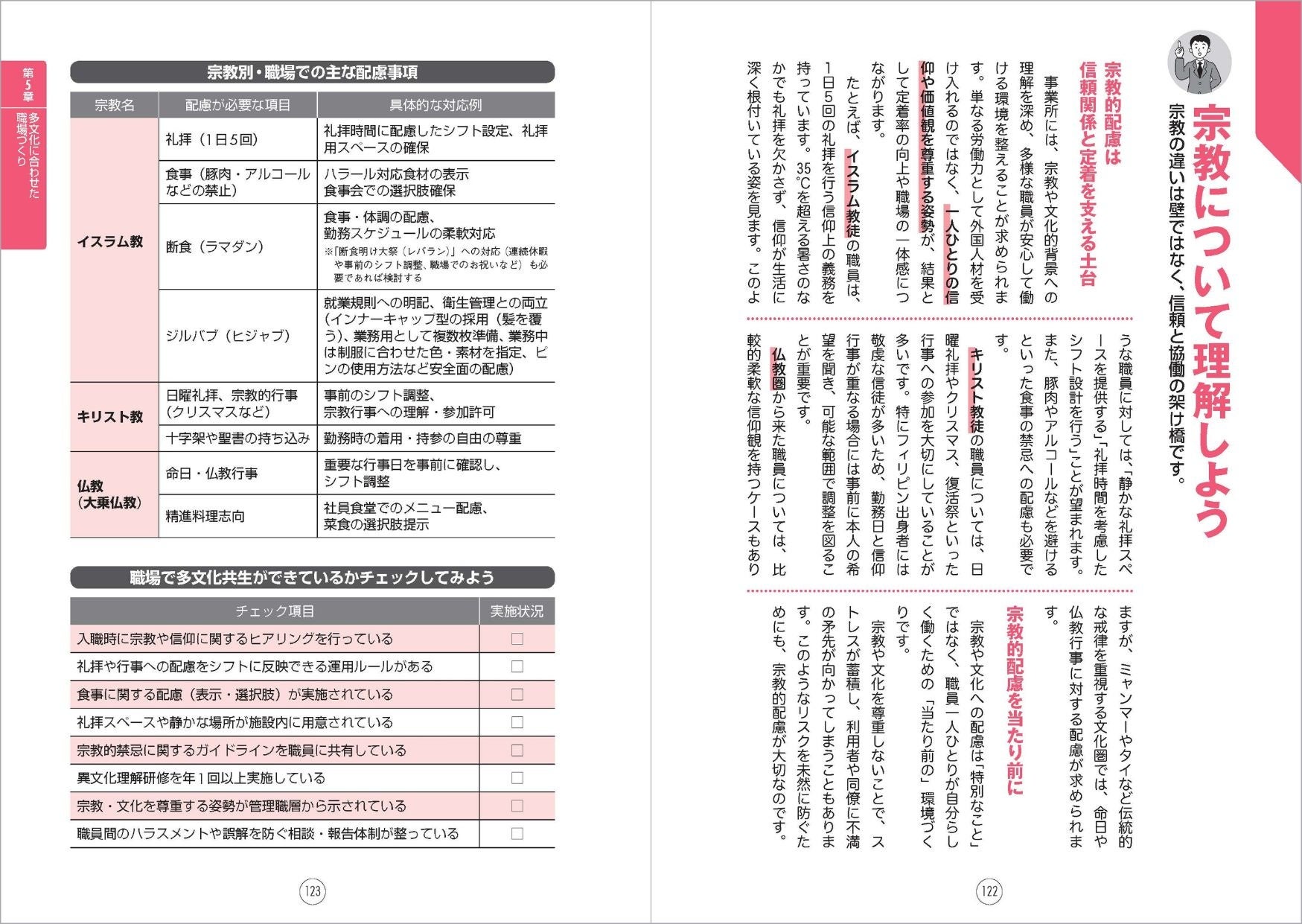 単なる制度や仕組みの紹介にとどまらず、どうすれば、多様な人材がいきいきと働き続けられる職場をつくれるのかに焦点をあてました。外国人職員の出身国に多い、フィリピン、インドネシア、ミャンマー、タイなど出身国別の送り出し制度や文化的配慮に加え、ICT・AIを活用した生産性向上の事例も収録。