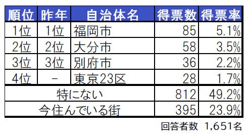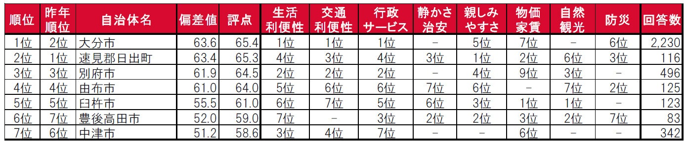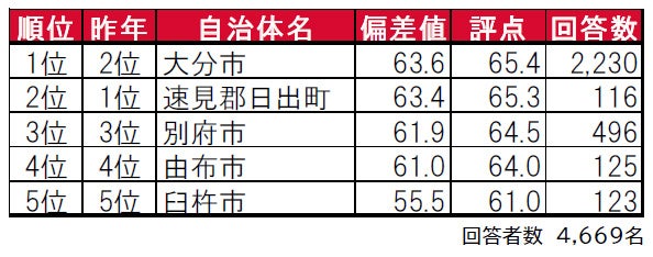 1位と2位の順位が入れ替わったもののTOP5の顔ぶれは変わらず、大分市とその周辺エリアの自治体が今年も上位に並ぶ結果となっています。