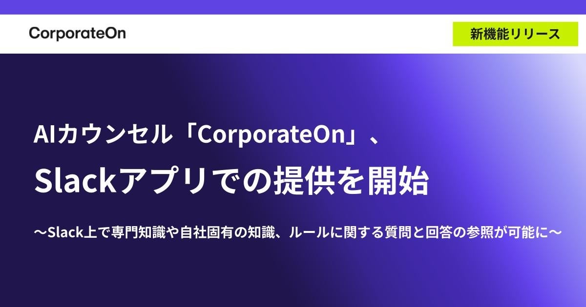 株式会社LegalOn Technologies(本社:東京都渋谷区、代表取締役 執行役員・CEO:角田 望)が提供する、AIカウンセル「CorporateOn」(https://lp.www.legalon-cloud.com/corporateon)は、Slackアプリでの提供を開始しました。Slackワークスペース上で確認したい事項を入力すると、弁護士や公認会計士などの専門家の知見や、社内規程や社内ルール、マニュアルなどの自社固有の知識をもとに回答が生成されます。これにより、「CorporateOn」にログインせずとも、知りたい情報へのアクセスが簡易になりました。