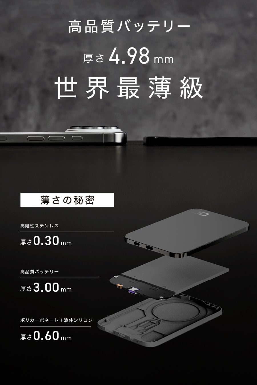厚さ4.98mm・重さ約82gのミニマル設計。 iPhoneの背面に装着しても出っ張らない、かさばらない。持ち歩いていることを忘れるほどの世界最薄クラスのモバイルバッテリーです。