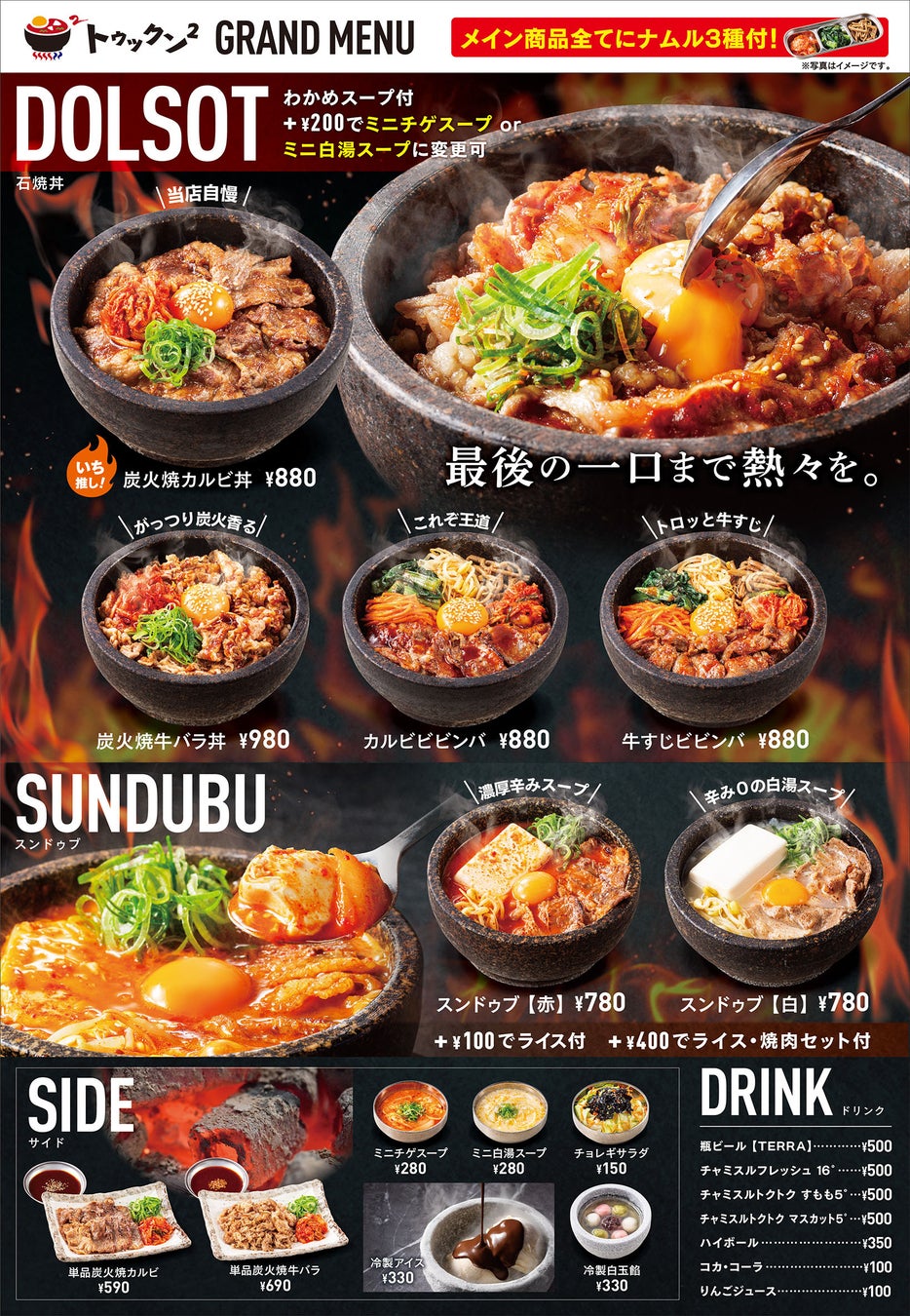 「トゥックン²」のロゴは、スンドゥブ(赤)のデフォルトとなる玉子・豆腐・青ネギの3アイテム入れ、誰が見てもスンドゥブと連想し易く、且つ熱々のしずる感とトゥックン²の「²」を火柱で演出しております。