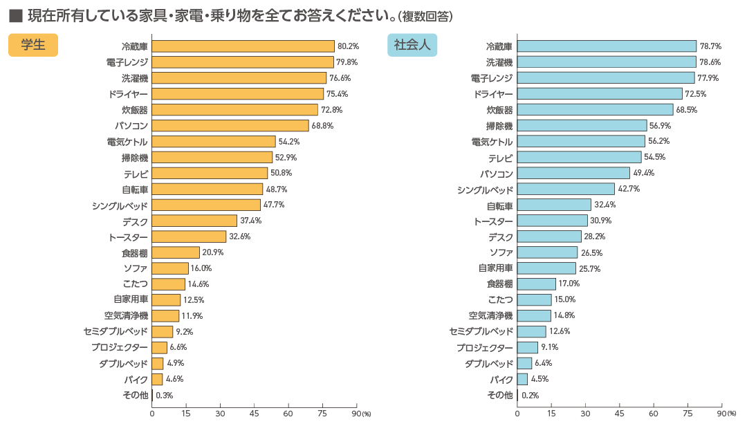 現在所有している家具・家電・乗り物は、学生社会人ともに「冷蔵庫」「電子レンジ」「洗濯機」「ドライヤー」「炊飯器」といった生活家電が上位で、それぞれ約7~8割が所有していました。一方、「自家用車」の所有率は学生12.5%、社会人25.7%の差が見られました。