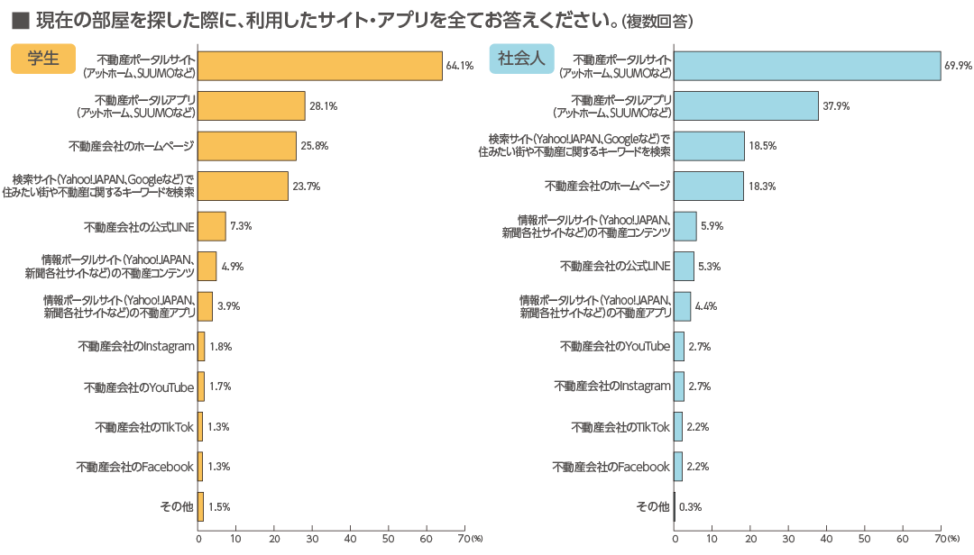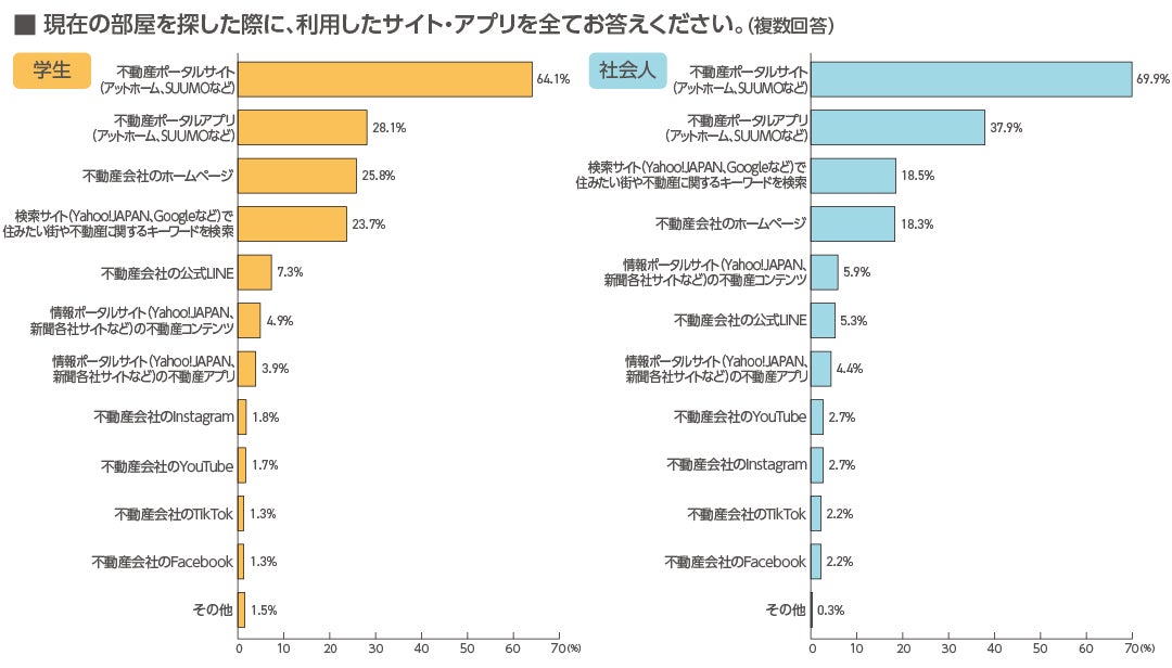 現在の部屋を探した際に利用したサイト・アプリは、学生・社会人ともに「不動産ポータルサイト」が最も多く、学生64.1%、社会人69.9%でした。また、学生は、社会人に比べて「不動産会社のホームページ」が7.5ポイント高く、社会人は、学生に比べて「不動産ポータルアプリ」が9.8ポイント高い結果となりました。