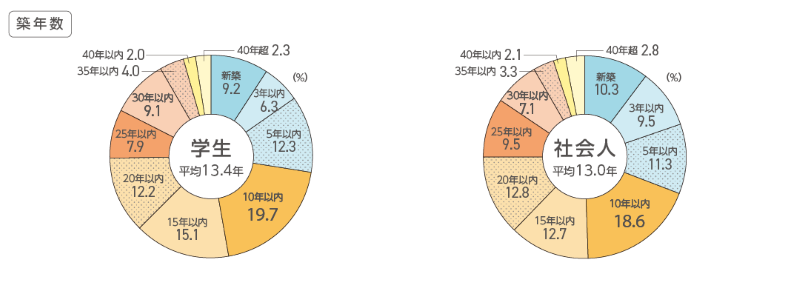 現在の部屋の築年数は、学生・社会人ともに「10年以内」が約20%でトップでした。学生・社会人ともに「新築」~「15年以内」の合計は6割を占め、築年数の平均は学生13.4年、社会人13.0年となりました。