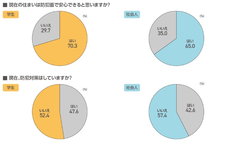 現在の部屋は防犯面で安心できるか聞いたところ、学生70.3%、社会人65.0%が「はい」と回答しました。なお、防犯対策の有無を聞いたところ、学生52.4%、社会人57.4%が「いいえ」と回答し、半数以上が防犯対策はしていないようでした。