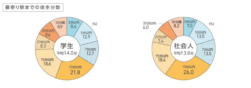 最寄り駅までの徒歩分数は、学生・社会人ともに「10分以内」「15分以内」がトップ2に入りました。「3分以内」から「15分以内」までを合計すると、それぞれ半数を超えました。