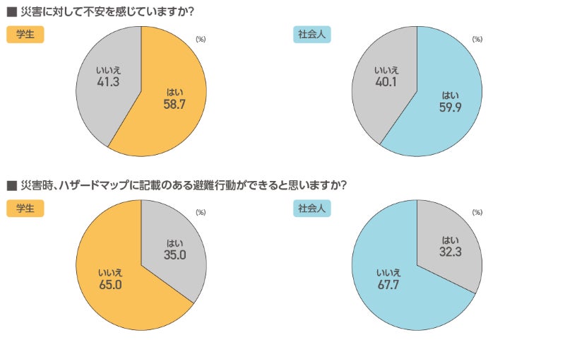 学生・社会人ともに約6割が災害に対して不安を感じていると回答しました。しかし、災害時にハザードマップに記載のある避難行動ができると思うか聞いたところ「いいえ」と答えた人は学生65.0%、社会人67.7%と避難に対しても不安を抱えている様子がうかがえます。