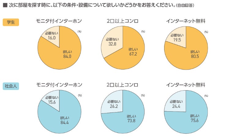 次に部屋を探す時に、「モニタ付インターホン」が欲しいと答えた学生は84.0%、社会人は84.4%でした。「2口以上コンロ」が欲しいと答えた社会人は学生と比べ6.6ポイント高く、「インターネット無料」が欲しいと答えた学生は社会人と比べ4.9ポイント高くなりました。